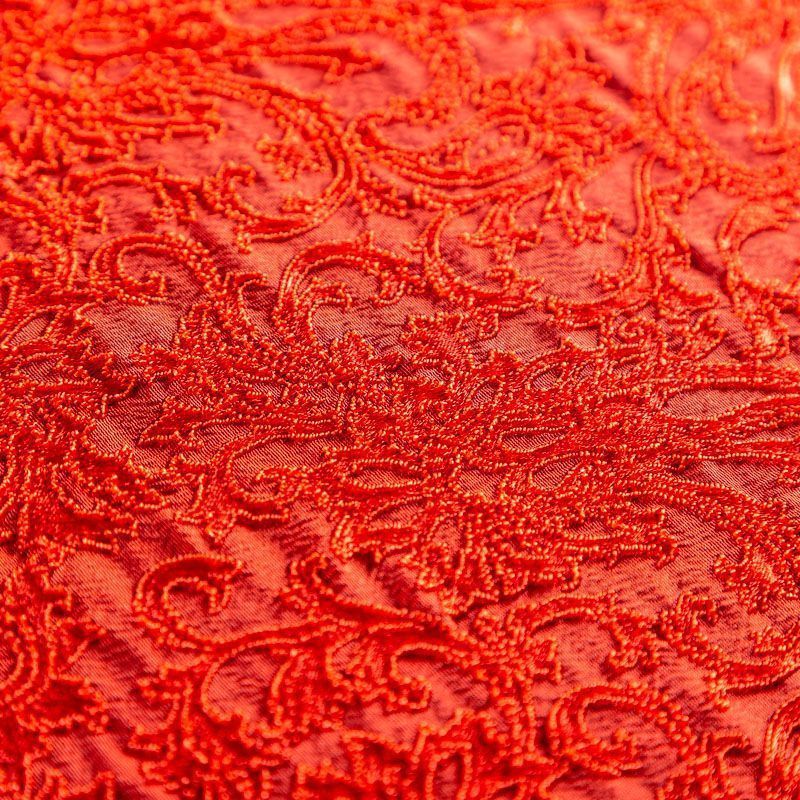 Итальянский жаккард с красивым сложным орнаментом насыщенного красного оттенка. Ткань легкая, но плотная, поверхность со сдержанным блеском объемная и текстурная, хорошо драпируется и держит форму, тянется за счет эластана в составе, не просвечивает. Подойдет для пошива нарядных вечерних костюмов, платьев-футляров в стиле Dior, жакетов, топов, легких пальто, бомберов, юбок или шорт.