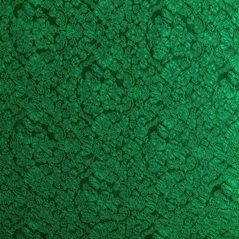Итальянский жаккард с красивым цветочным дизайном темно-зеленого оттенка. Ткань легкая, но плотная, поверхность со сдержанным блеском объемная и текстурная, хорошо драпируется и держит форму, тянется за счет эластана в составе, не просвечивает. Подойдет для пошива нарядных вечерних костюмов, платьев-футляров в стиле Dior, жакетов, топов, легких пальто, бомберов, юбок или шорт.