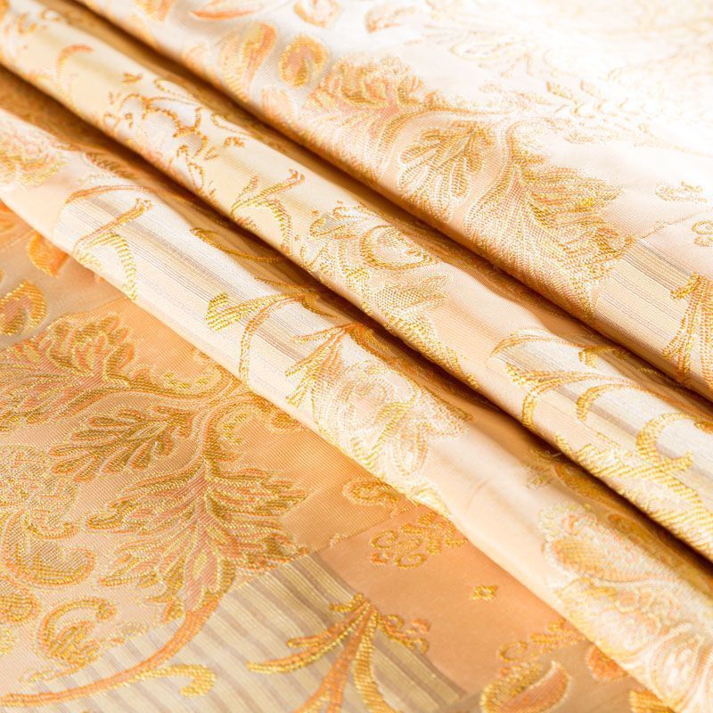 Итальянский жаккард с красивым сложным орнаментом, имитирующим вышивку, персикового оттенка. Ткань плотная, поверхность со сдержанным блеском объемная и текстурная, хорошо драпируется и держит форму, не тянется, не просвечивает. Подойдет для пошива нарядных вечерних костюмов, жакетов, корсетов, платьев-футляров в стиле Dior, легких пальто, бомберов, юбок или шорт.