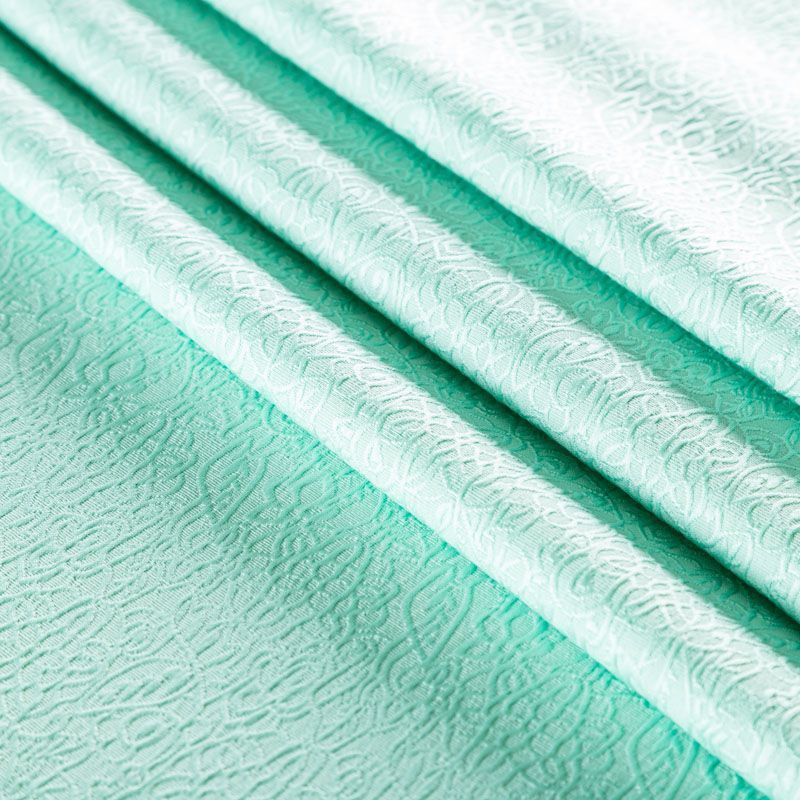 Нарядный жаккард на хлопковой основе с красивым сложным орнаментом мятного оттенка. Ткань легкая, но плотная, поверхность со сдержанным блеском объемная и текстурная, хорошо драпируется и держит форму, тянется за счет эластана в составе, не просвечивает. Подойдет для пошива нарядных вечерних костюмов, платьев-футляров в стиле Dior, жакетов, топов, легких пальто, бомберов, юбок или шорт.