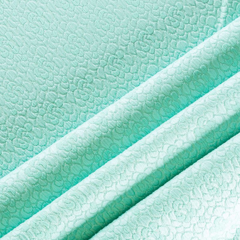 Нарядный жаккард на хлопковой основе с красивым стилизованным орнаментом мятного оттенка. Ткань легкая, но плотная, поверхность со сдержанным блеском объемная и текстурная, хорошо драпируется и держит форму, тянется за счет эластана в составе, не просвечивает. Подойдет для пошива нарядных вечерних костюмов, платьев-футляров в стиле Dior, жакетов, топов, легких пальто, бомберов, юбок или шорт.
