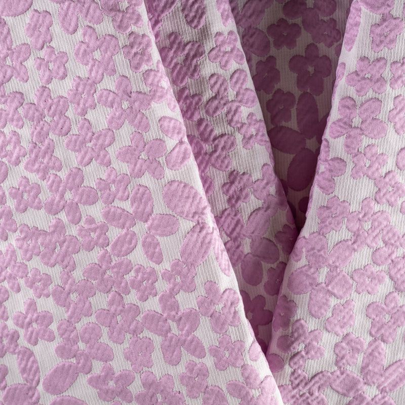 Молочный рельефный фон итальянского жаккарда дополнен узором из объемных разновеликих цветов простой формы нежного розового оттенка. Ткань легкая, средней плотности, не просвечивает, не тянется. Хорошо держит форму и драпируется. Идеально подойдет для платьев различных силуэтов, костюмов, жакетов, юбок, шорт, легких пальто.