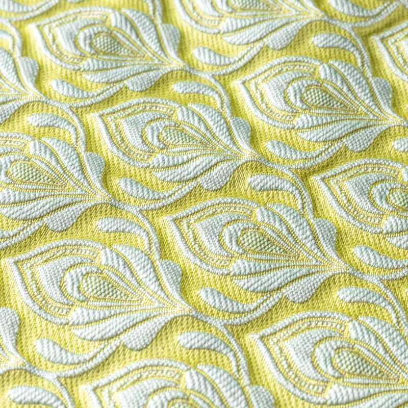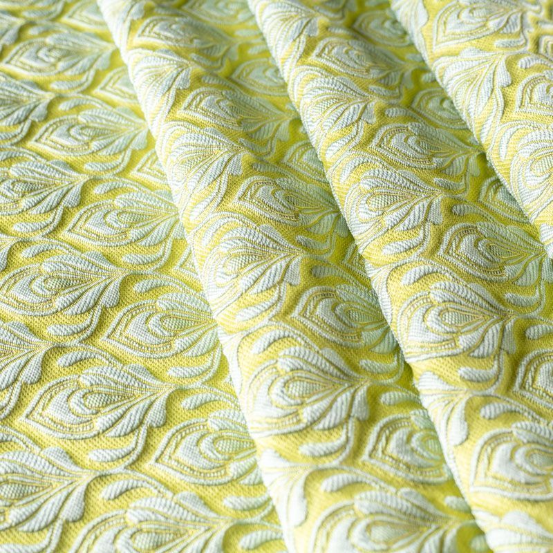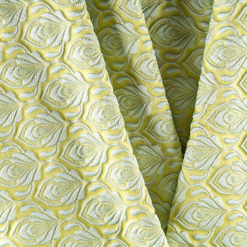 Необычный лаймово-желтый фон итальянского жаккарда дополнен объемным фантазийным узором холодного голубого оттенка. Ткань легкая, средней плотности, не просвечивает, не тянется. Хорошо держит форму и драпируется. Идеально подойдет для платьев различных силуэтов, костюмов, жакетов, юбок, шорт, легких пальто.
