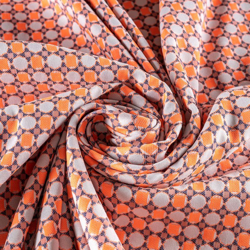 Мягкий жаккард с ярким геометрическим узором. Ткань пластичная, непрозрачная, поверхность фактурная, приятная на ощупь, тянется за счет эластана в составе, немного жержит форму, хорошо драпируется. Будет комфортна для пошива костюма, женственного платья, юбки, брюк, шорт, легкого пальто или мягкого бомбера.