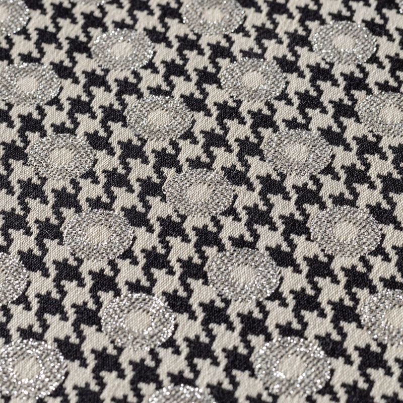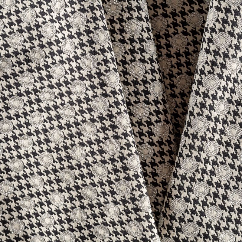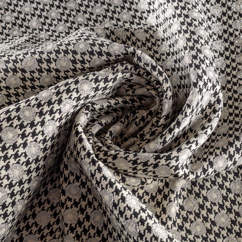 Итальянский хлопковый жаккард с классическим узором пье-де-пуль (гусиная лапка) украшен небольшими кружочками с серебристым люрексом. Ткань средней плотности, поверхность матовая, фактурная, хорошо драпируется и держит форму, тянется за счет эластана в составе, не просвечивает. Подойдет для пошива нарядных вечерних костюмов, платьев-футляров в стиле Dior, жакетов, топов, летних пальто, бомберов, юбок или шорт.