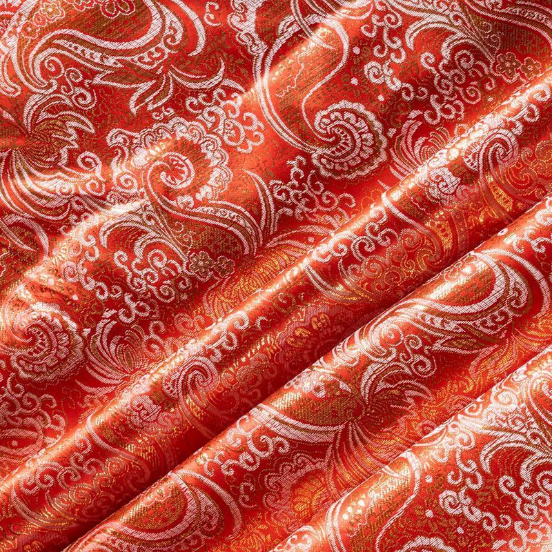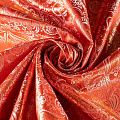 Насыщенная ткань плотного переплетения с декоративной поверхностью, покрытая сложным орнаментом из блестящих нитей. Ткань легкая, отлично драпируется, держит форму, отличается прочностью, долговечностью, износостойкостью и простотой в уходе, не смотря на свою высокую декоративность. Нарядность ткани придает золотая люрексовая нить. Подходит для пошива юбок, платьев, топов, сценических костюмов.